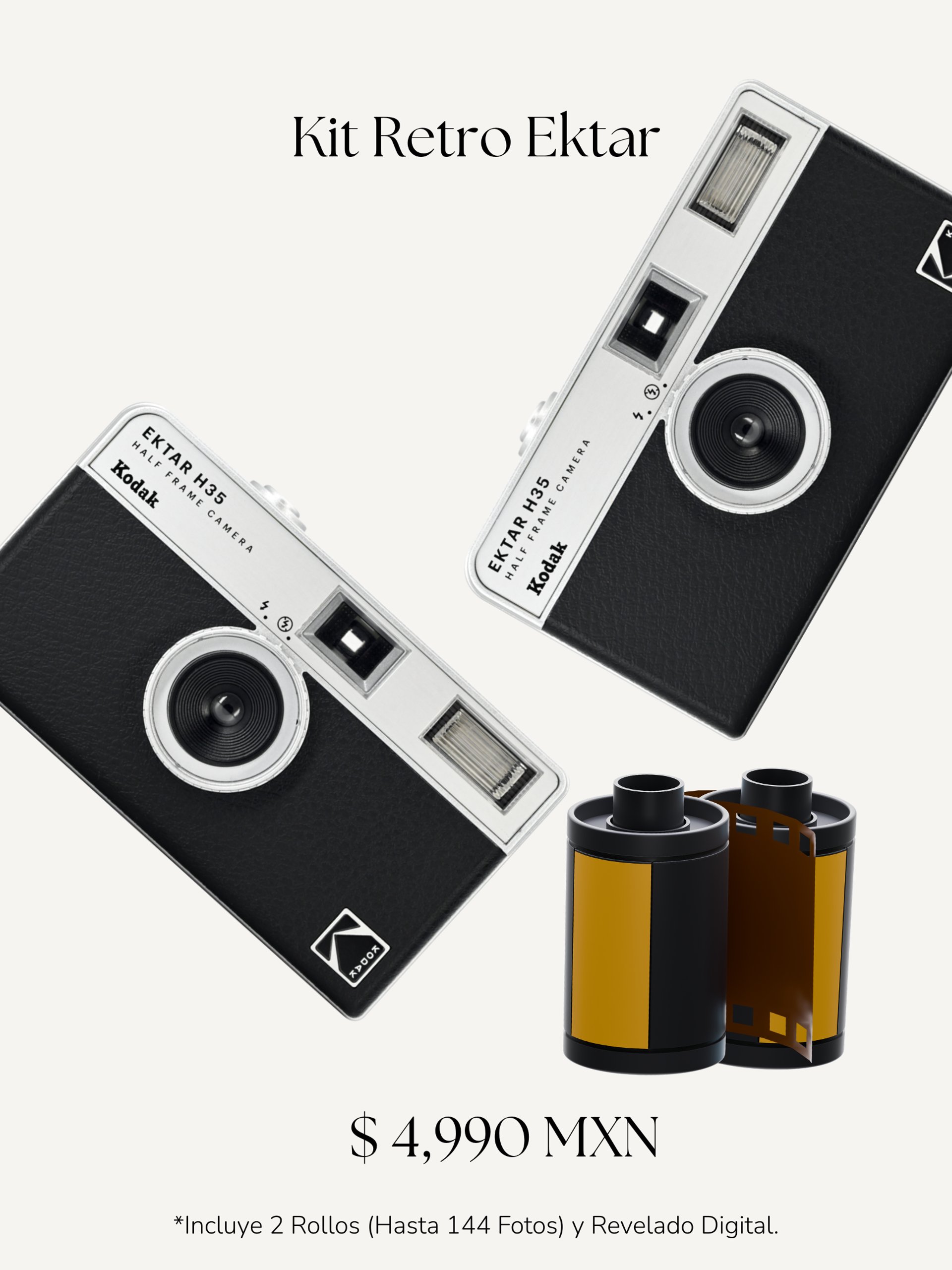 $4,990: 2 cámaras + rollos + revelado digital.
